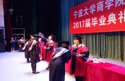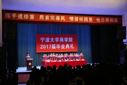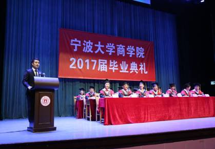 2017届学生毕业典礼暨学位授予仪式在林杏琴会堂举行。学院全体领导、各系、所、学位点负责人、毕业班班主任、2017届全体毕业生以及家长代表出席了典礼。本次毕业典礼由院党委副书记邵丽主持。  典礼上,范院长代表学院向全体毕业生表达了衷心的祝贺与殷切期望,同时也希望同学们永保坚持不懈、努力奋斗的态度,永保读书学习、探索新知的习惯,永保胸怀天下、为国为民的抱负,艰苦奋斗,勇于创新,敢于担当,努力成为让母校引以为傲的“商界精英”。胡书记代表学院宣布了2017届优秀毕业生名单,优秀毕业生代表依次上台领奖。浙江省优秀学生干部宋双、国家奖学金获得者符栋栋以及宁波市跨境电子商务职业技能大赛铜奖获奖者Shadman分别代表本科、硕士和留学生毕业生上台发言,他们与全体毕业生们一起追忆了在黄色小说
