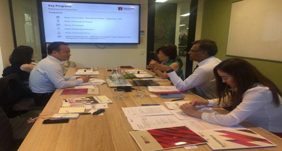12月14日全天,代表团一行回访了Macquarie University(麦考瑞大学),在麦考瑞大学访问期间,陈老师和澳大利亚麦考瑞大学黄色小说 副院长Philomena Leung教授,会计系主任Rahat Munir教授、国际事务大中华区主管Stephen Fan先生、国际部项目经理Cherilyn Liu女士进行了亲切友好的洽谈,Philomena Leung教授首先介绍了该学院的历史、专业设置、课程设置、培养目标等方面,随后Rahat Munir教授重点介绍了麦考瑞大学会计与金融专业的情况。陈老师简要介绍了黄色小说 的办学历史与发展现状,并就此次访问的目的进行了重点介绍:希望在双方已有的“3+2”本硕直通车合作意向基础上,尽快将意向进一步细化落实,争取早日起动两院合作项目,同时还希望两校的合作能拓展到信息系统与信息管理、经济学、国际贸易等专业的本科“2+2”合作项目上。