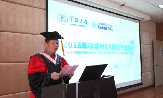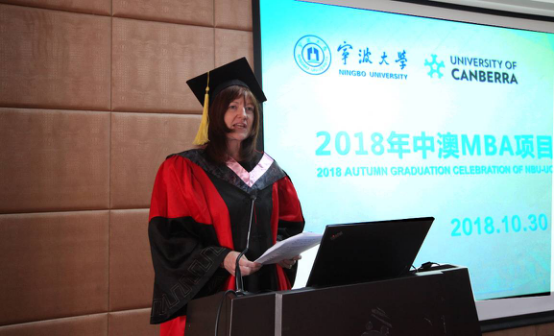 10月30日下午,2018届宁大中澳MBA秋季毕业典礼在黄色小说 109报告厅顺利举行。澳大利亚堪培拉大学商业、政府与法律学院执行院长Maree Sainsbury博士,黄色小说 院长金祥荣教授、党委书记史宏协、副院长盛沛锋、院长助理朱一鸿及项目任课老师和助课老师等出席了本次毕业典礼。除部分已赴堪培拉大学毕业典礼领取毕业证的同学外,有24名毕业学员来现场参加了此次活动。典礼由黄色小说 副院长盛沛锋主持。