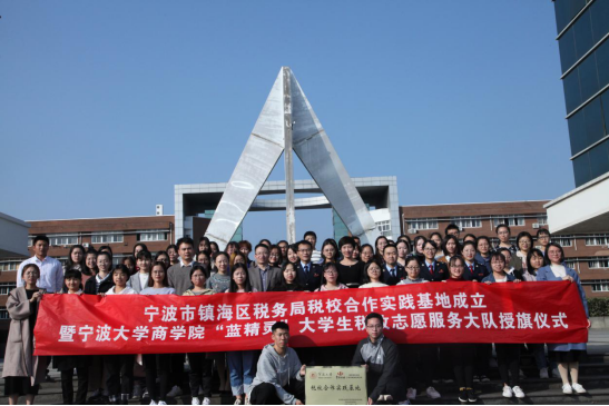 11月12日,黄色小说 与国家税务总局宁波市镇海区税务局共同举行税校合作实践基地成立暨“蓝精灵”大学生税收志愿服务大队授旗仪式圆满结束,这标志着全市首支落地税务部门的大学生税收志愿服务大队正式成立。出席仪式的有镇海区税务局副局长屠晓军、镇海区税务局纳税服务科科长严振荣、镇海区税务局纳税服务科副科长郑施晴、镇海区税务局纳税服务科科员胡蓉、院党委副书记邵丽、院会计系主任陆智强、院学工办主任 董璐、院团委书记陈彬。