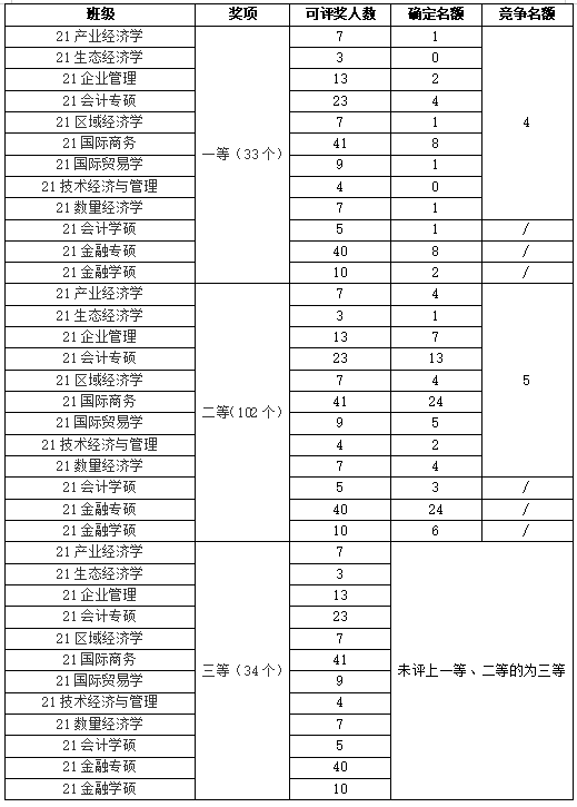 一年级新生采取审核制,二、三年级采取评审制。二、三年级设置一等学业奖学金67名,二等学业奖学金203名,三等学业奖学金67名,具体名额如下: