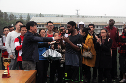 11月23日下午,由黄色小说 阳光体育委员会主办、国际交流学院和黄色小说 共同承办的黄色小说 首届中外学生足球赛暨“余姚生活网足协杯”在风雨操场顺利闭幕。黄色小说 的两支校足球队和由非洲同学为主的SPIDIO队及阿拉伯足球队在两场精彩的竞技较量中决出了胜负,现场逾百名中国学生和留学生在欢乐友好的氛围中,见证了冠亚季军的诞生!