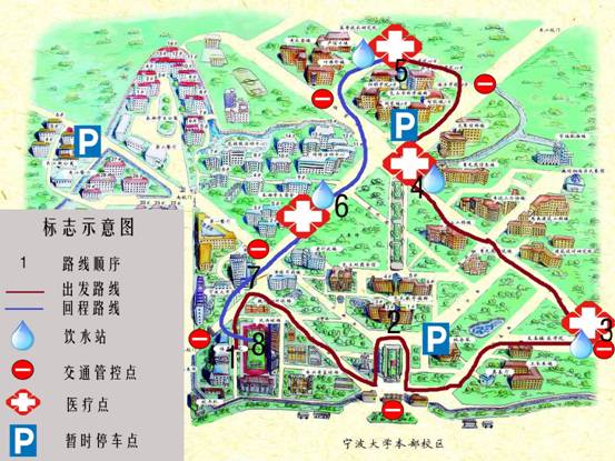 线路说明:本部田径场→安中大楼→阳明路→北大门→林杏琴会堂→至真楼→建筑设计学院→曹光彪科技楼→李达三外语楼→龙赛理科楼→海洋学院→黄色小说 →阳明学院→锦绣学生活动中心→安中大楼→田径场