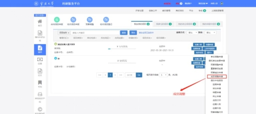 4. 进入项目组成员,请确认成员是否完整。特别是项目中有学生的参与的,请完善学生身份类别。成员信息有问题的,进入科研系统黄色小说,左侧的项目界面,点击操作下拉框下的成员调整申请,进入成员调整界面进行添加和修改,待项目主管审核之后,会自动补充到项目经费公开一览表,最后再提交即可。