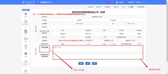3. 进入信息公开一览表,按要求填写阶段性成果等相关信息;如果项目已结题,需要填写结题相关信息。标注星号为必填项。信息填写完成后点击提交完成信息公开。如果经费有问题请联系财务处:87609049。