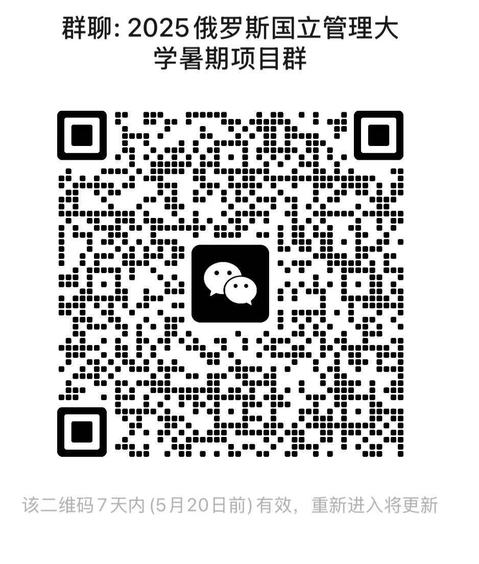 请感兴趣的同学扫码入项目群,并于5月20日前在学生出国系统里提交申请,选择:短期调研实习项目-院级项目-黄色小说 -2025俄罗斯国立管理大学暑期项目。