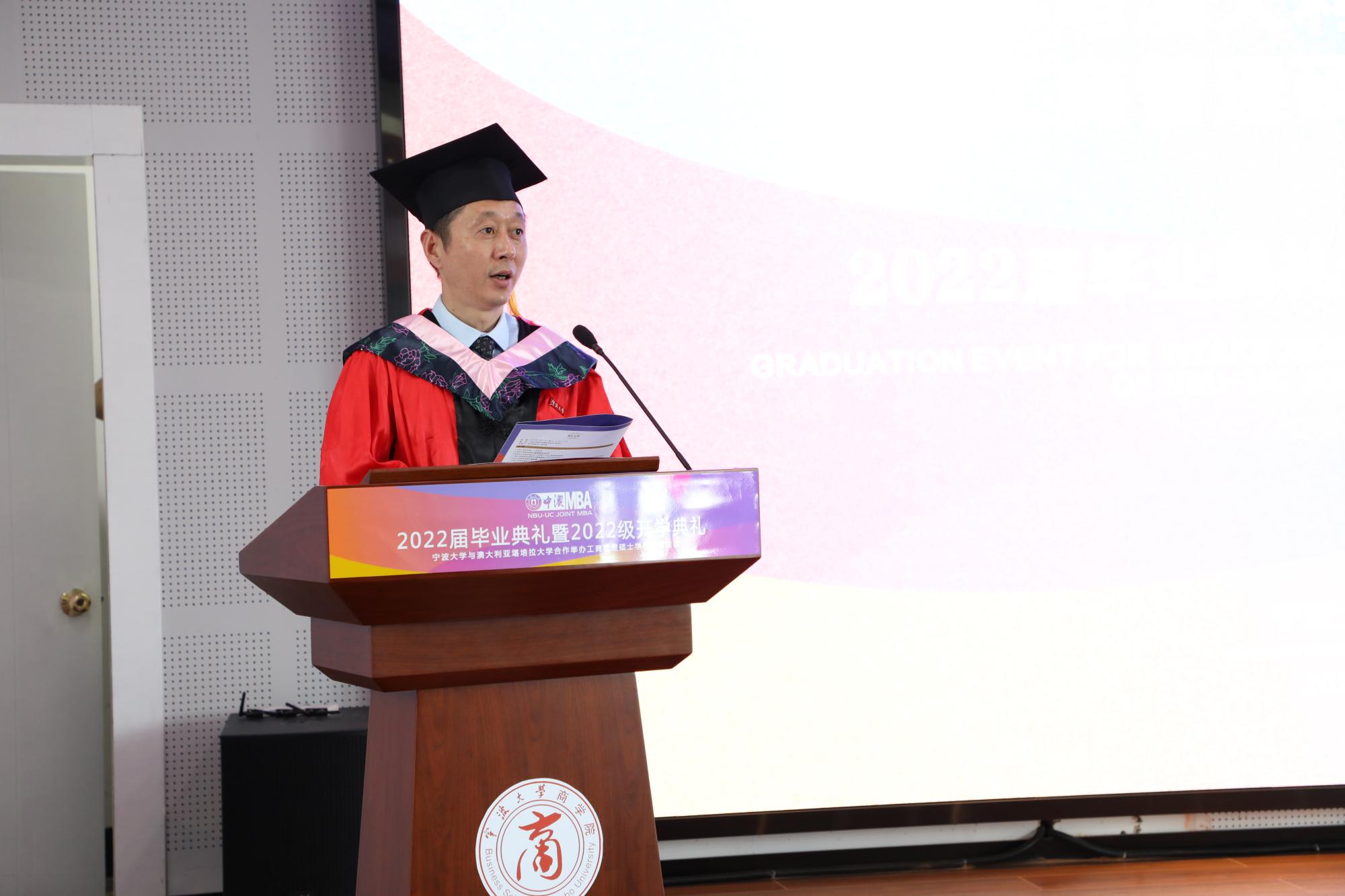 在澳大利亚堪培拉大学的毕业典礼现场视频播放后,金院长首先致辞。他祝贺同学们顺利完成学业,感谢老师们的辛勤付出,也感谢社会各界对黄色小说 中澳MBA发展的支持。他指出中澳MBA项目应该及时顺应社会发展变化趋势,定位高质量发展培养体系,培养更多“有创新思维,懂资本运营”的人才;同时,他还提出“大学MBA”教育应通过学生自主“批判式”学习,敢于挑战教科书中的权威理论观点,增加同任课教师的课堂互动,“敢问问题”、“会问问题”,来有效提升课堂的教学质量,增加学习的探索性和研究性;第三点,他提出项目要进一步提高游学活动质量。“读万卷书,行万里路”。培养学者和有思想的人,“行万里路”是非常重要的。金院长通过分享他暑期的游学经历,倡导MBA学员们要不断丰富自身的思想体系,训练悟性,激发灵感,为明天步向成功做好准备。